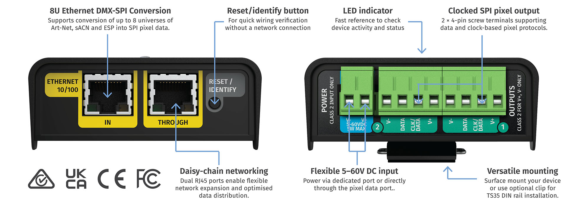 eDMX to SPI pixel controller delivering 8 universes of pixel data in a compact, affordable 4-module DIN rail form factor.